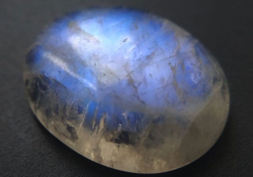 Адуляр, или лунный камень, – алюмосиликат натрия и калия, самый ценный минерал из группы полевых шпатов. Свое название камень получил от горного массива Адула в Швейцарии, где он впервые был обнаружен. Его твердость 6,–6,5. Это минерал прозрачно-молочного оттенка с перламутровым блеском и голубым сиянием, из-за которого его и прозвали лунным камнем. Голубое свечение создается благодаря вкраплениям другого минерала – альбита, располагающегося слоями. Чем толще слои альбита, тем ярче свечение.