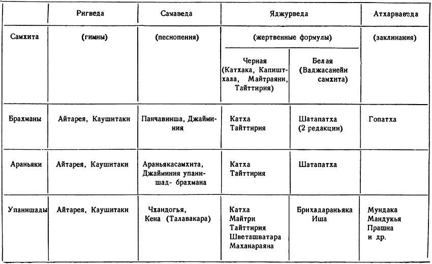Перечисленные разделы ведийской литературы составляют шрути (śruti — «услышанное»), т. е. откровение, внушенное будто бы свыше поэтам-мудрецам — риши (ṛṣi). Традиционную схему шрути в сжатом виде см. на стр. 9.